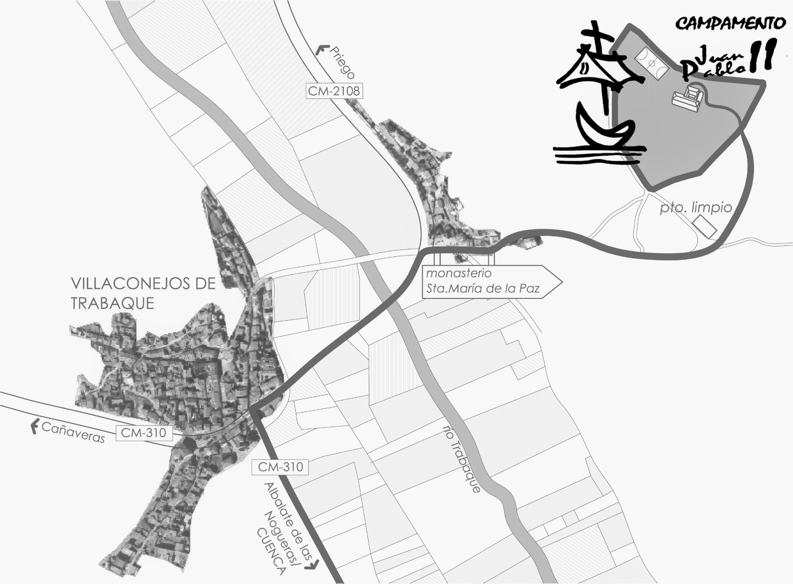 El albergue «Monasterio de Santa María de la Paz» – Campamento Juan Pablo II se encuentra en el pueblo de Villaconejos de Trabaque, a tan sólo media hora de Cuenca y una hora y media de Madrid y muy cerca de los municipios conquenses de Priego y de Beteta. Es un terreno con una extensión vallada de 5 hectáreas, en la frontera entre La Alcarria y la Serranía, un paisaje que regala preciosos atardeceres cada día. Además, existe la posibilidad de realizar caminatas y marchas por el campo para poder disfrutar de la naturaleza.