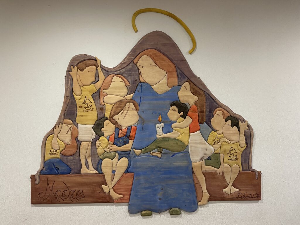 El campamento tiene un albergue o casa con capacidad para 114 personas, divididas en 25 habitaciones de 2, 4 y 6 camas y todas equipadas con baño y agua caliente. Este edificio también dispone de baños repartidos por la planta baja y una cocina industrial perfectamente equipada con todo tipo de electrodomésticos. Dentro del inmueble hay una pequeña capilla, así como un comedor y otras salas de menor tamaño. Todo el albergue tiene calefacción. Por su parte, un acogedor claustro ofrece un oasis de paz y hace de nexo entre la parte interna y la externa.